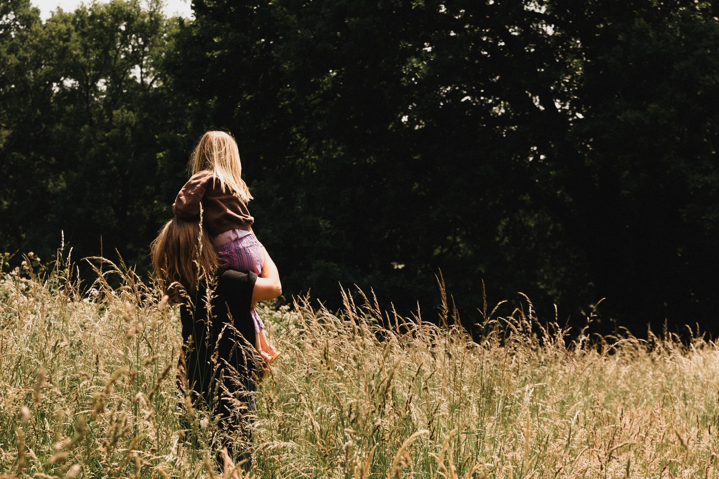 Moeder en kind spelen samen buiten in het veld met de zon in hun haren en blote voeten.